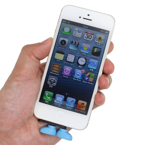 写真を見ても分かるように、足の部分はクルクルっと向きを調整可能。さらに横へと可動することもできるので、足を大きく開かせるとiPhoneを立たせることもできます。カラバリはホワイト・ブラック・ブルー・オレンジの4種類。お好みの「足」を選んで自由にカスタマイズしちゃいましょう! お値段は299円です。