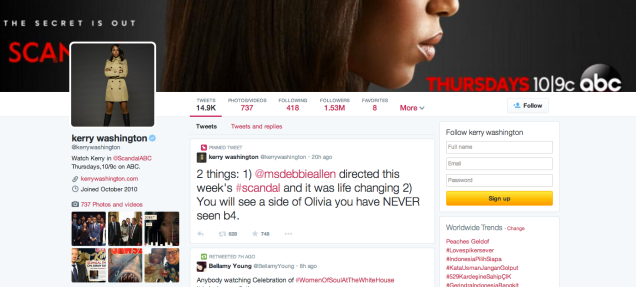 そんなことより面白いのは、自分のページに何を表示できるか選べるようになったこと。ツイートの山に埋もれてる好きなツイート、自分らしいツイートを引っ張りあげて、プロフィールのトップに「ピン」留めできるので、ページ見にきた人にも、たまたまなんかの悪口吐いてみっともない姿を晒してる最新の自分ではなく、一番機嫌がいいときの自分を見てもらえます。例えば上に貼ったのは、女優ケリー・ワシントンのページ。